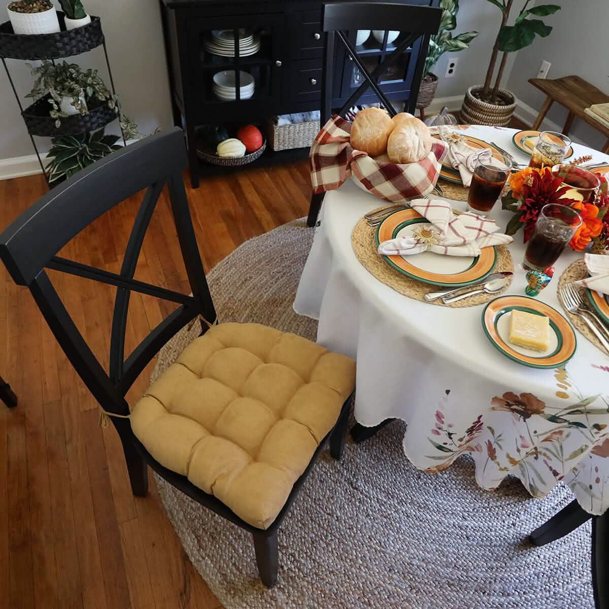 These solid-color dining chair cushions are made from soft, durable microfiber microsuede fabric in a neutral camel hue. They're filled with imported latex foam for ultimate comfort, and are more durable and less prone to deformation than other foams (unlike polyester fiberfill). Each cushion features reinforced straps, whipstitching, and tear-resistant triple-stitched banding for added durability. Perfectly complement your kitchen or dining room decor.